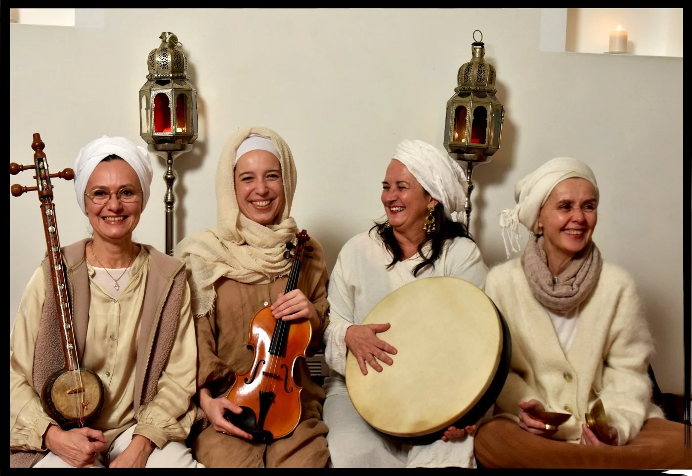 Sufi Healing Music Sessions: Veronika Rahime Winkler (Rebab, voice), Annerose Amira Jost (Water sounds, voice), Claudia Hopfinger-Uhl (Percussion, voice), Clémence Malak Hazaël-Massieux (Violin, voice, composition)